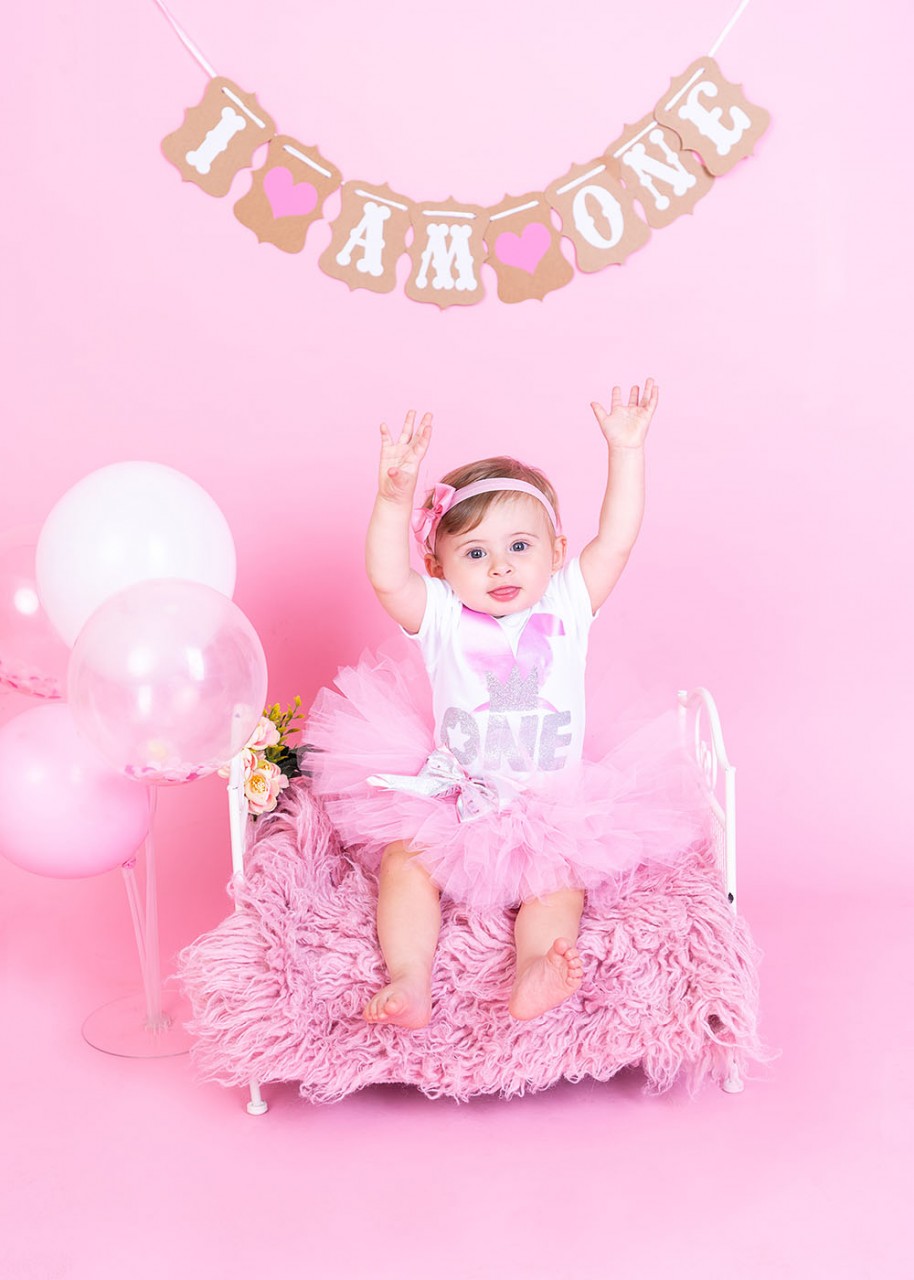 The final shot. We created this setting to match her outfit. Pink wall, baby pink blanket, and lots of balloons – that was the perfect backdrop to declare that she has turned one. Her jubilance rubbed on us too.