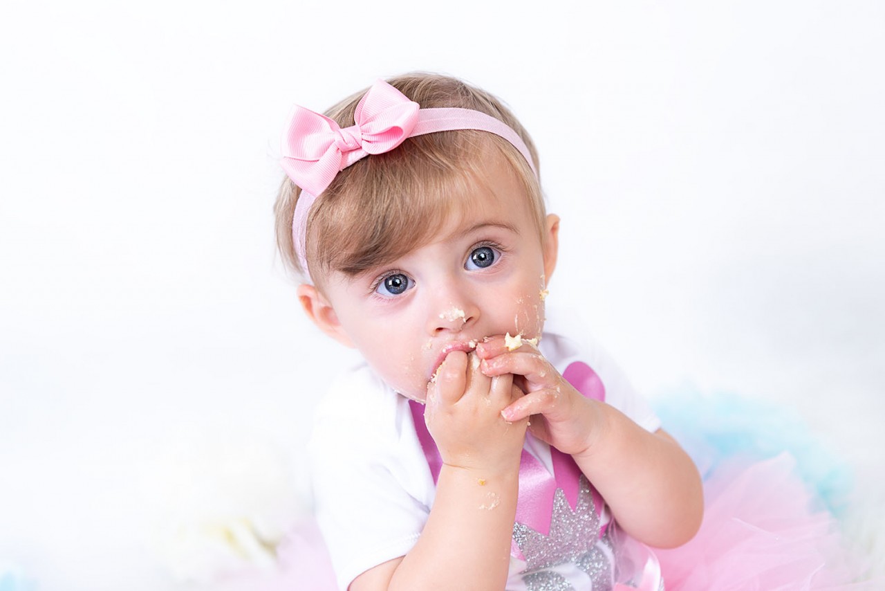 Here comes the big moment. Eden tasted the cake! With her face smeared in cream and frost, she looked longingly at the camera. We took a close shot to highlight her angelic expression.
