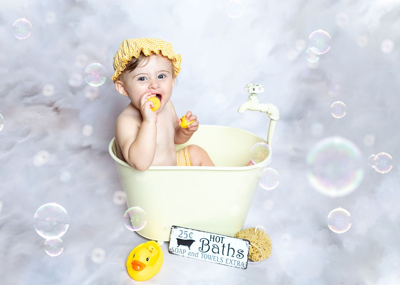 It was time to clean up, and Eden happily got into the tub we had designed for her. She played with her toys and gave such cute expressions – that's how we completed her bathtub photography. She was spreading cheer and joy in her white and yellow checked cap just like a sunflower.