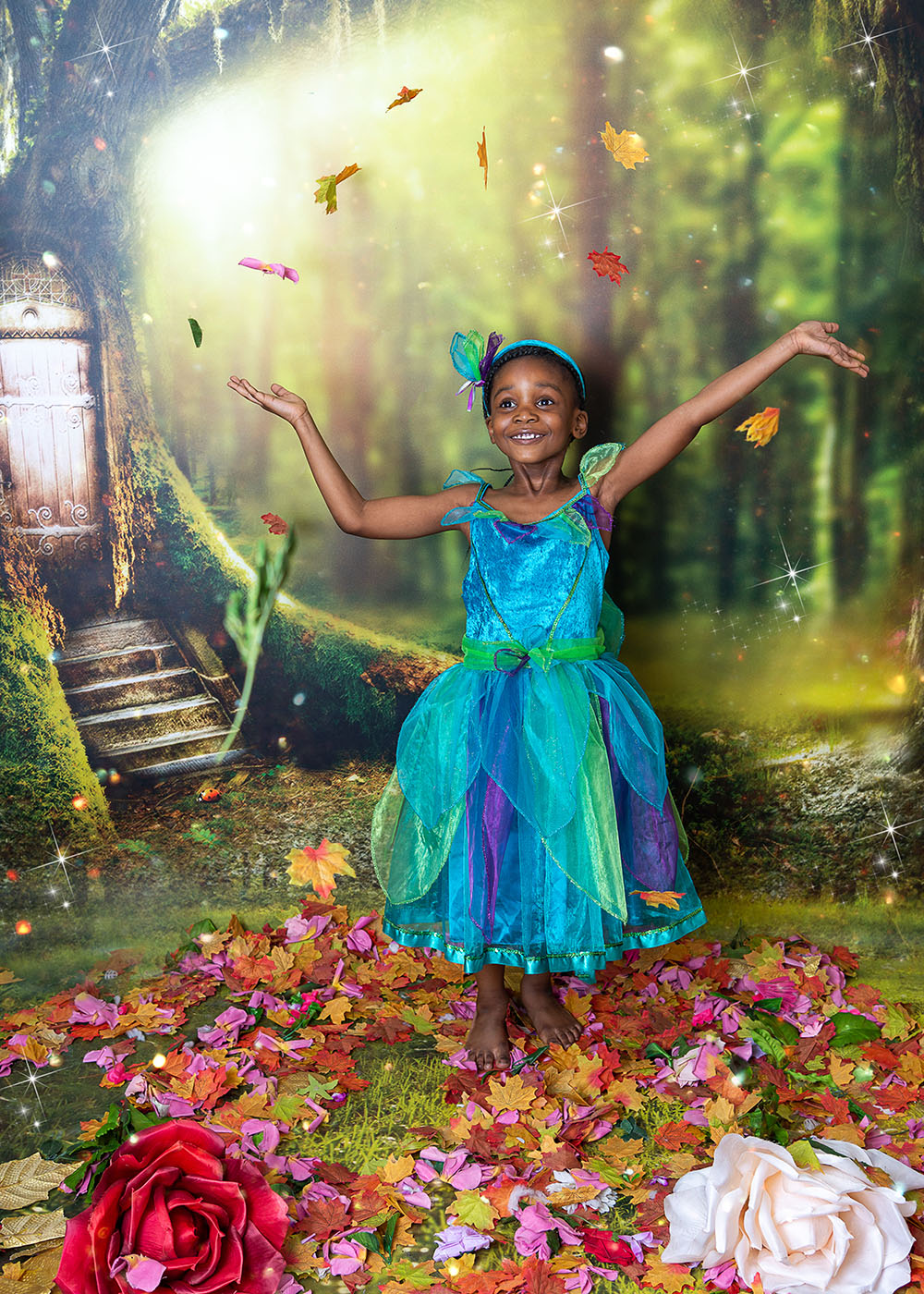 Lilliane chose a fairy dress for this shoot. With different shades of blue, she looked like a fairy. Her hairband matched her dress well. She liked the set, much to our happiness, and started playing with the colourful leaves we had spread on the floor. We watched her through her lens, bright and happy, lost in her vibrant world. Our patience paid, and we got the perfect shot that captured her gorgeous smile and mood.