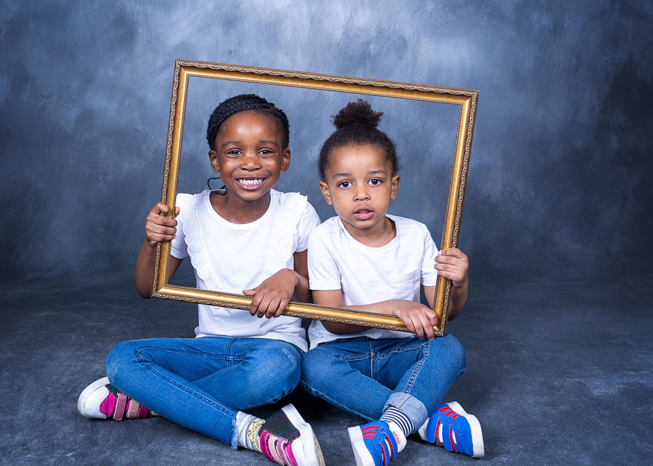We decided to introduce the siblings first. Lilliane and Raphael were in casuals. We matched the backdrop with their white-tee, and blue jeans look. With just an empty frame in their hands, the photo got a different dimension. They sat cross-legged on the floor and were so happy with the setup. We chatted with them to get friendly. We wanted the shot to look natural but never expected it to be so poignant and candid.