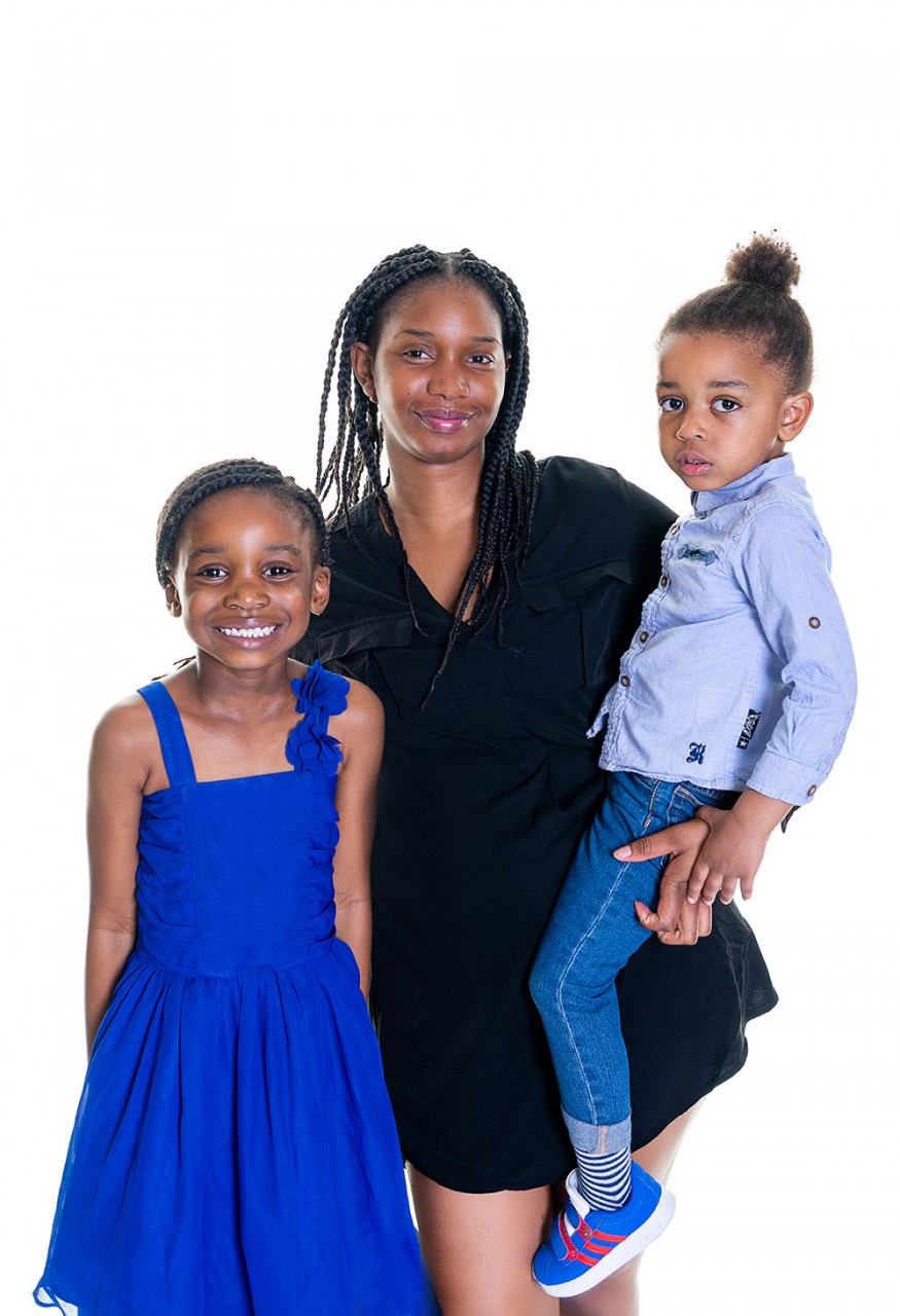 It was time for a family photo, so Tapiwa joined her children. She wore a simple black dress. With her multiple-braided hair, she looked cool and stylish. Lilliane changed into a simple blue dress while Raphael rocked in a cute shirt. He felt comfortable in his mom's lap. Lilliane enjoyed the shoot and was all smiles. Her broad grin made our day!