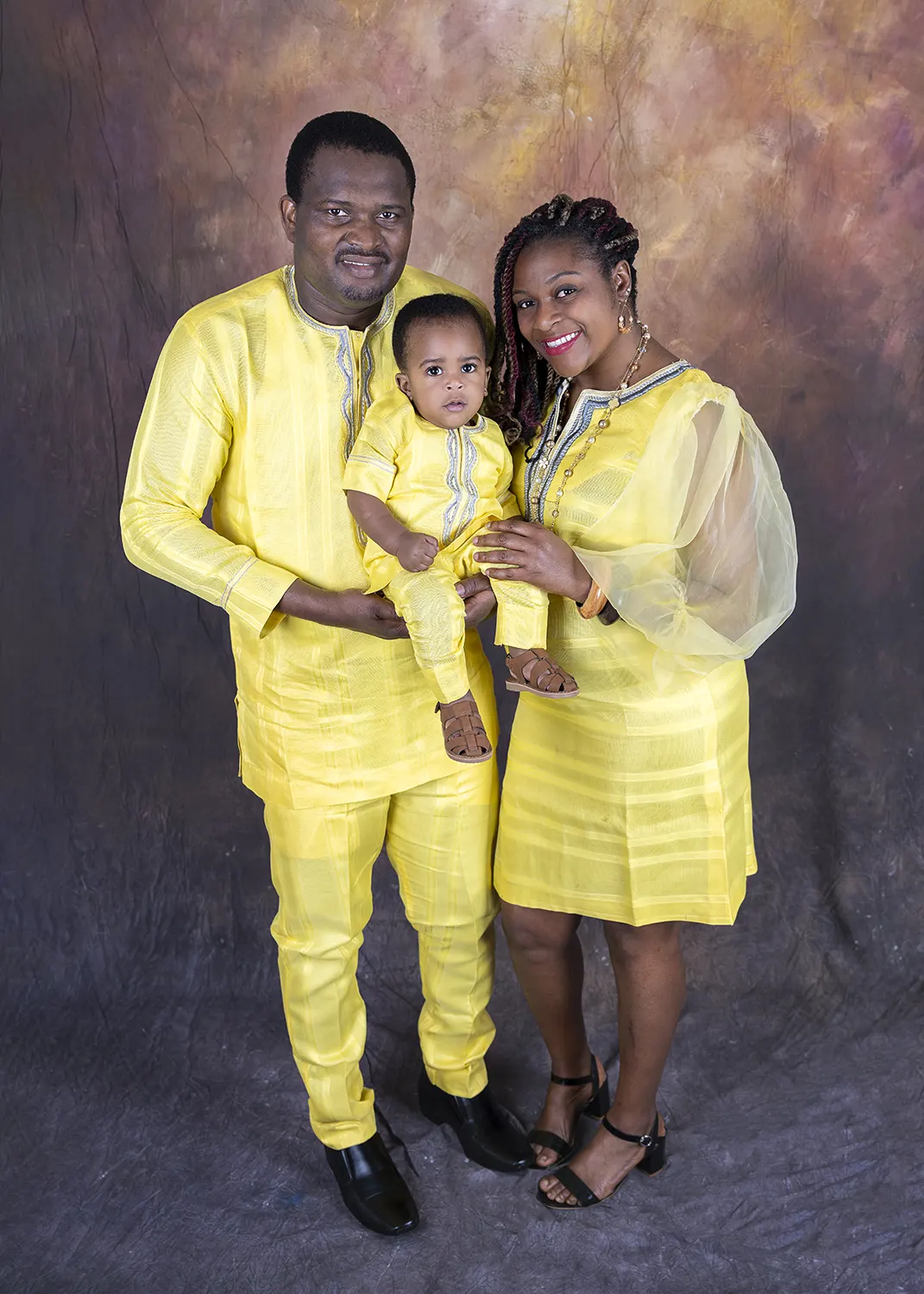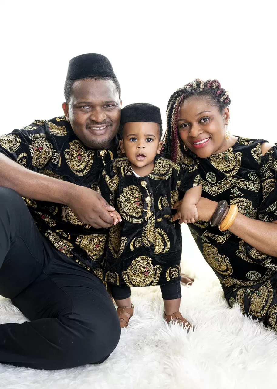 The second shot we took for the Orji family photography is a gem. Firstly, the family looked fabulous in their black and gold attire. You don't need any props as the combination is enough to draw everybody's attention. However, the star of the photo is Lotachi. Look at his expression! He was bubbling with energy as his parents held him for the shoot. The tiny mouth, wide open with astonishment, matched the admiration that glowed in his beady eyes. Priceless! Shots like this make us do more family photography.