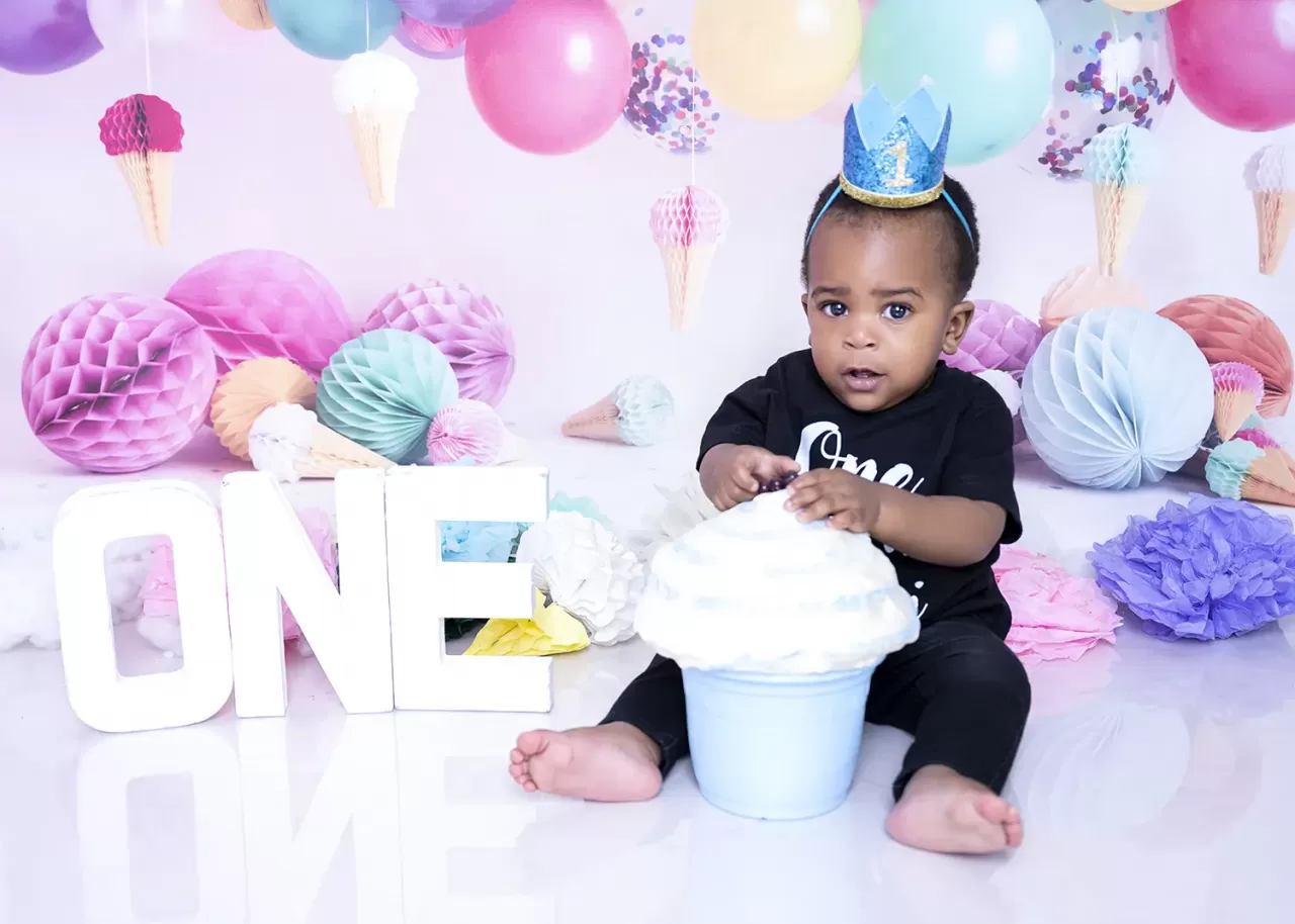 It was time to take solo photos of Lotachi. We created a set for him, with stuffed toys in the background and a cake to celebrate his birthday. You can see him holding a wooden number block and staring at the camera. He was happy to get all the attention.