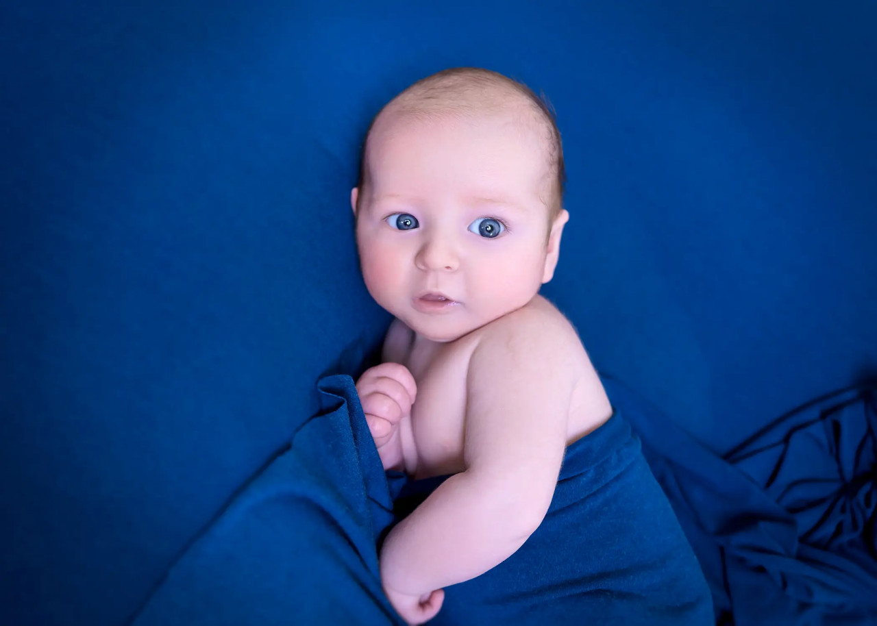 On the photoshoot day, when the family gathered in our studio, it felt like a family reunion. Suggestions poured in, and we were happy to listen to the grannies' ideas. It was decided unanimously that the first photo of the album would be of Sonny. So here is the blue-eyed boy, wrapped in a blue towel against a blue background. Look at those eyes, full of wonder! He must have been enjoying the cacophony around him.